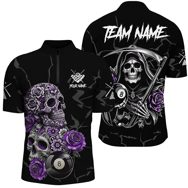 Personalized Purple Funny Skull Roses 8 Ball Billiard Shirts For Men Custom Pool Team Shirts Design TDM2756