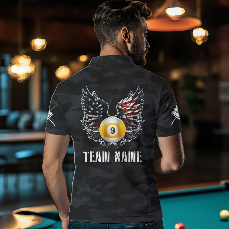 Personalized Camouflage US Flag Billiard Shirt For Men, Funny Patriotic 9 Ball Wings Pool Jersey TDM4479