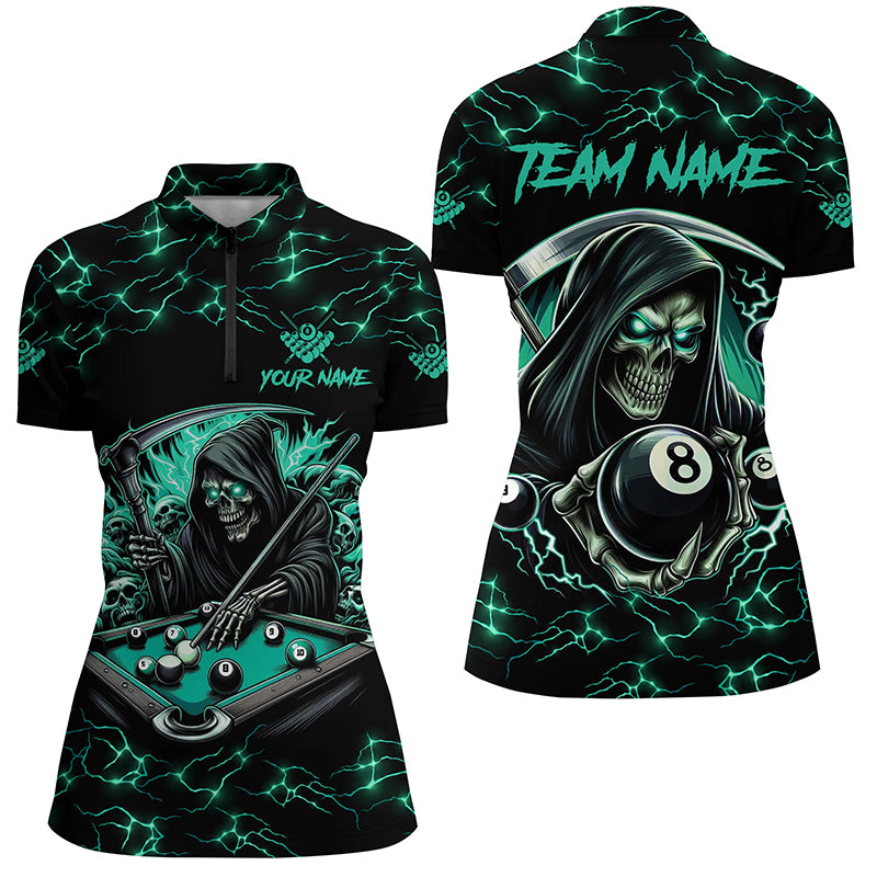 Turquoise Funny Death Skeleton 8 Ball Pool Women Billiard Shirts Custom Lightning Billiard Jerseys TDM2040
