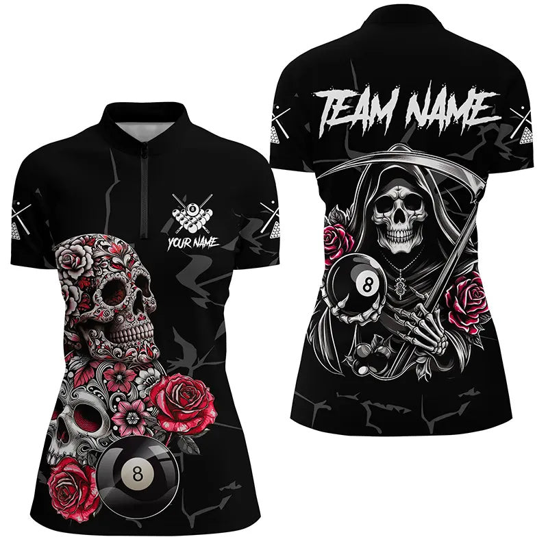 Personalized Red Funny Skull Roses 8 Ball Billiard Shirts For Women Custom Pool Team Shirts Designs TDM2755