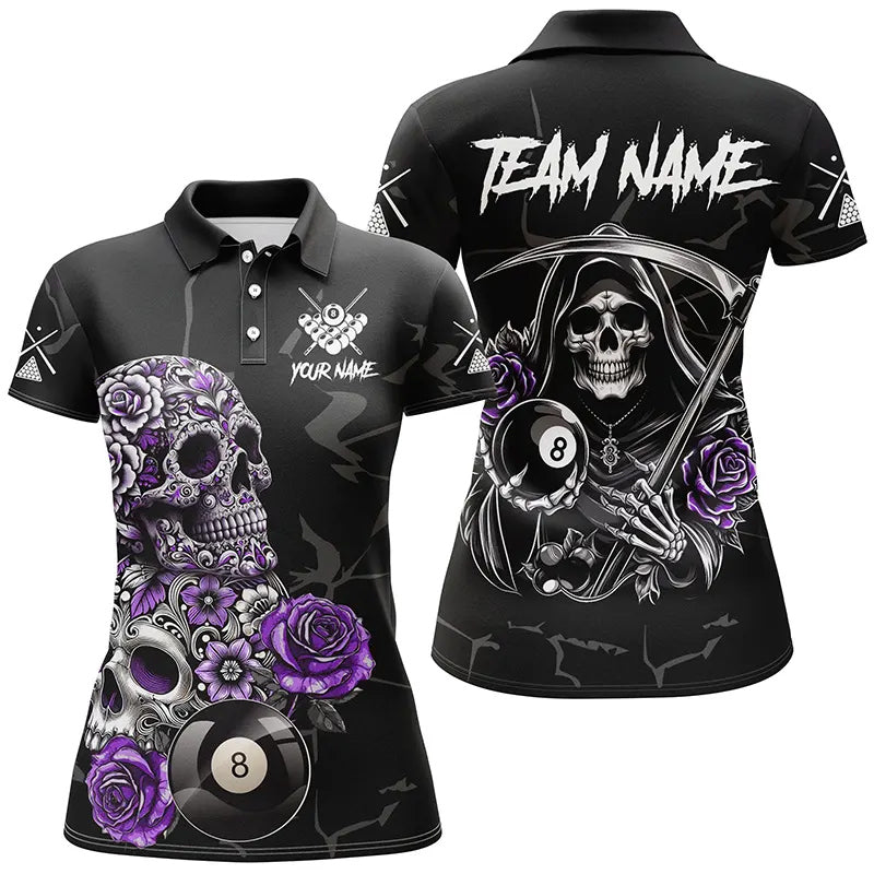 Personalized Purple Funny Skull Roses 8 Ball Billiard Shirts For Women Custom Pool Team Shirts Design TDM2756