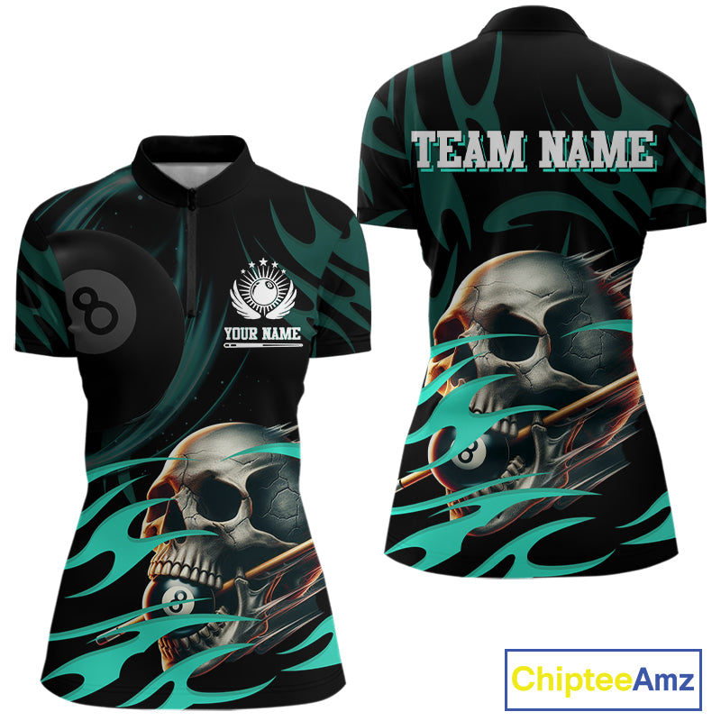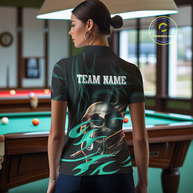 Turquoise Funny Skull 8 Ball Pool Shirt For Women Custom Billiard Team Jersey Polo & 1/4 Zip TDM4424