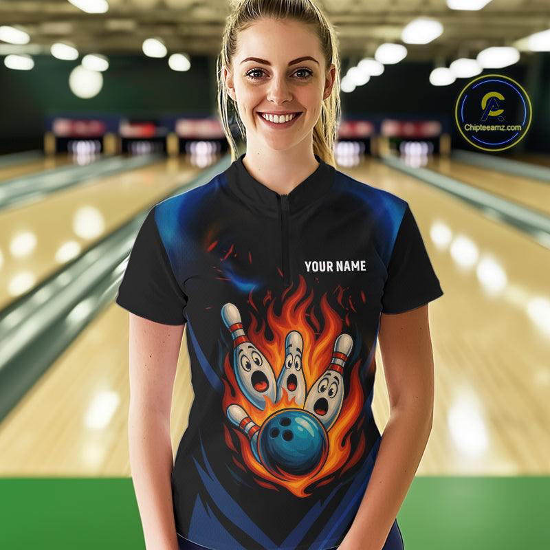 Blue and Black Flame Bowling shirts for Women custom funny bowling ball and pins team bowler jerseys NQS10260