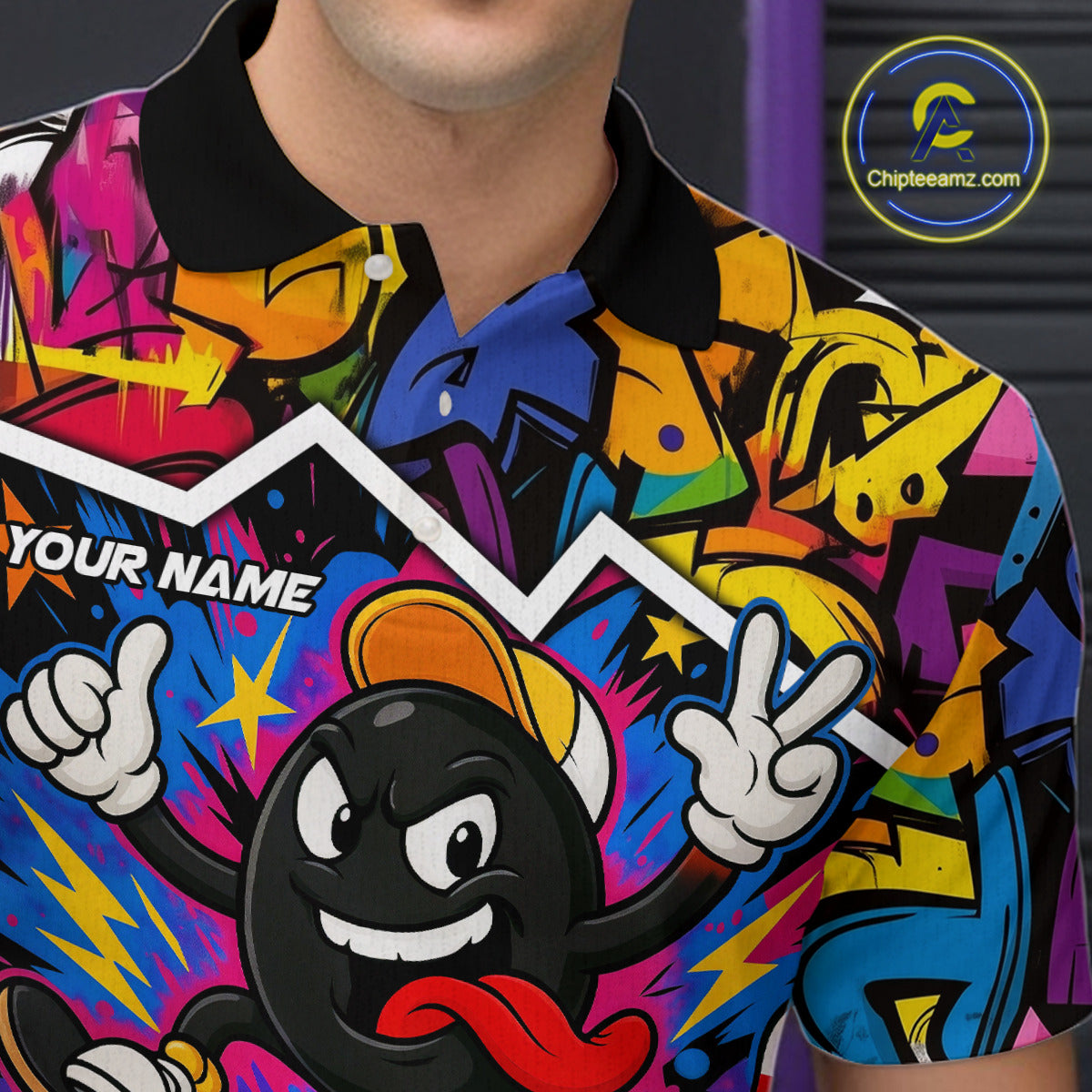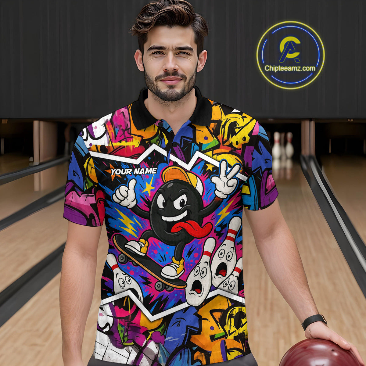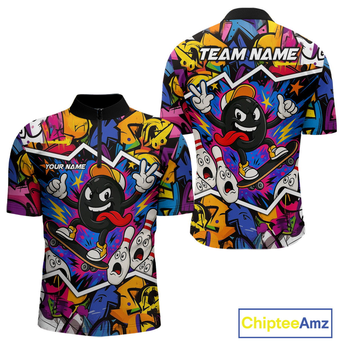 Colorful graffiti pattern Funny Bowling polo, quarter zip shirts for men custom Bowling team jerseys NQS10389