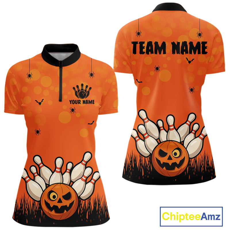 Custom Funny orange Bowling Team Shirt Halloween Polo & Quarter-Zip Bowling Jersey for Women NQS10396