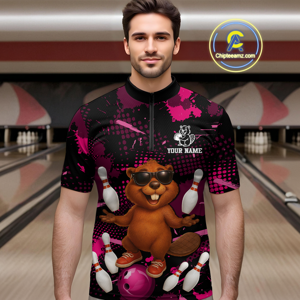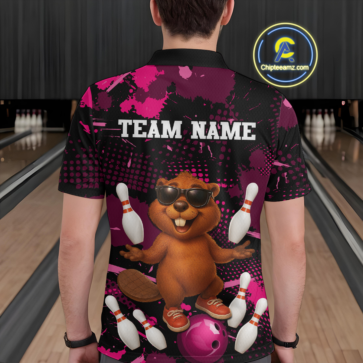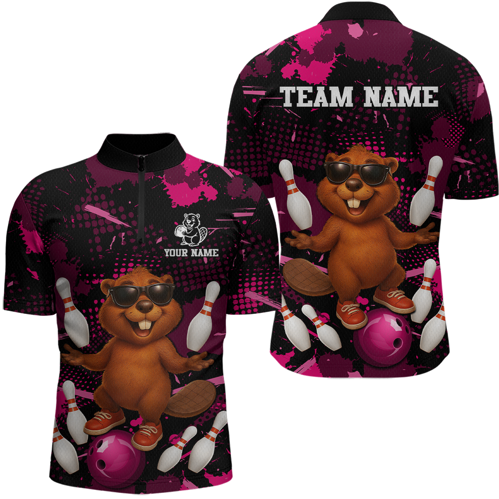 Custom Pink Funny Beaver Bowling Team Shirt Men Bowling League Jersey Polo Bowling Outfit QZT764