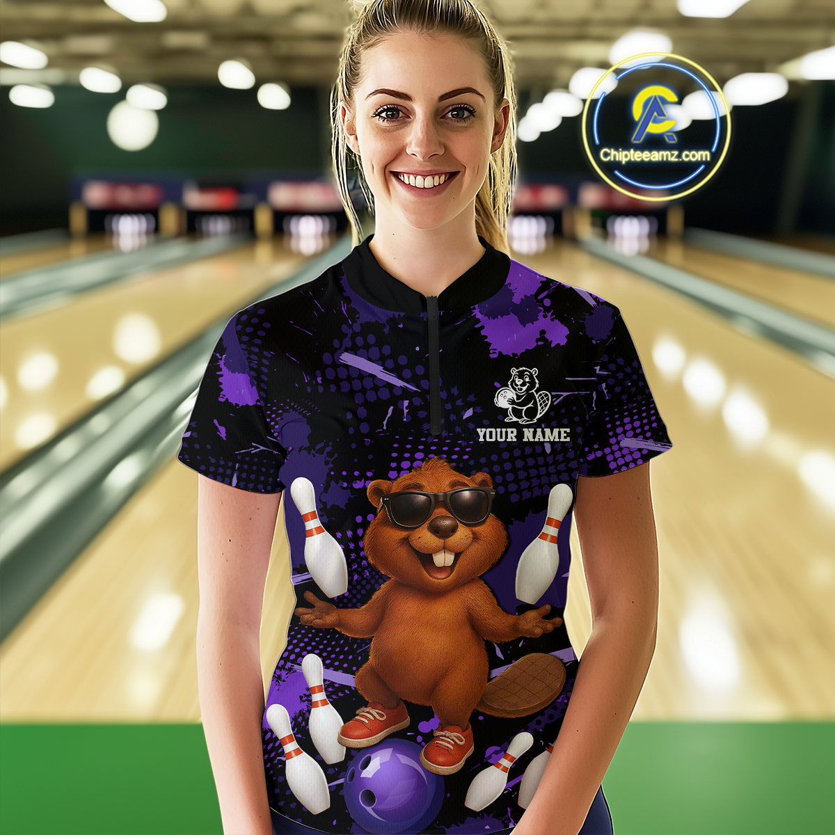 Custom Purple Funny Beaver Bowling Team Shirt Women Bowling League Jersey Polo Bowling Outfit QZT764
