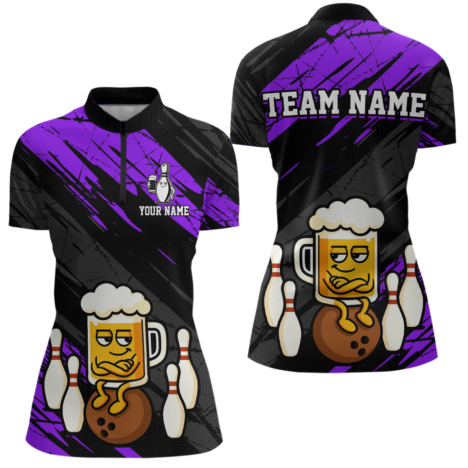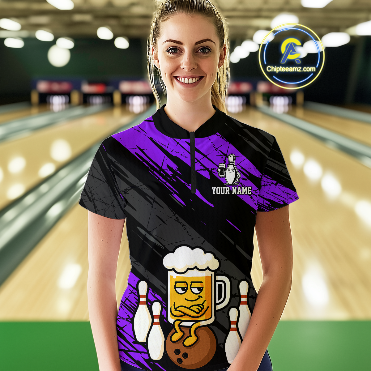 Custom Purple Funny Beer Bowling Jersey for Women Bowling Uniform Polo & 1/4 Zip Bowling Team Shirts HNT107