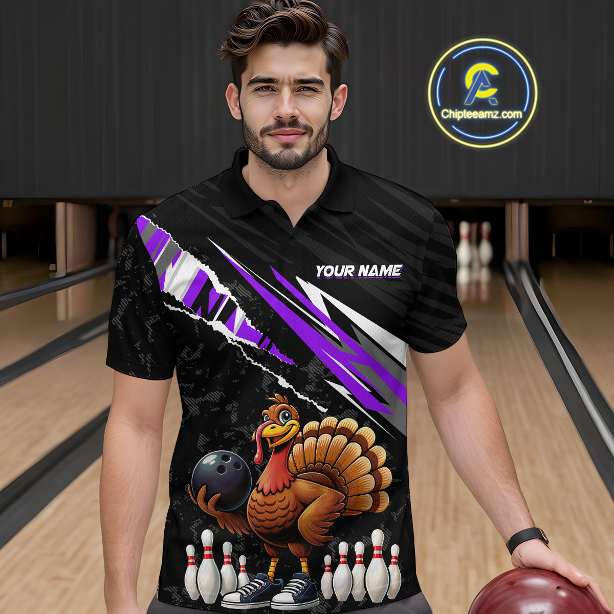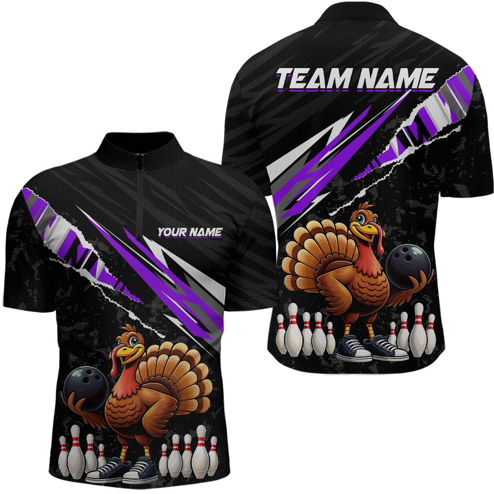 Custom Purple Funny Turkey Bowling Jersey for Men Thanksgiving Bowling Shirts Polo & 1/4 Zip HNT117
