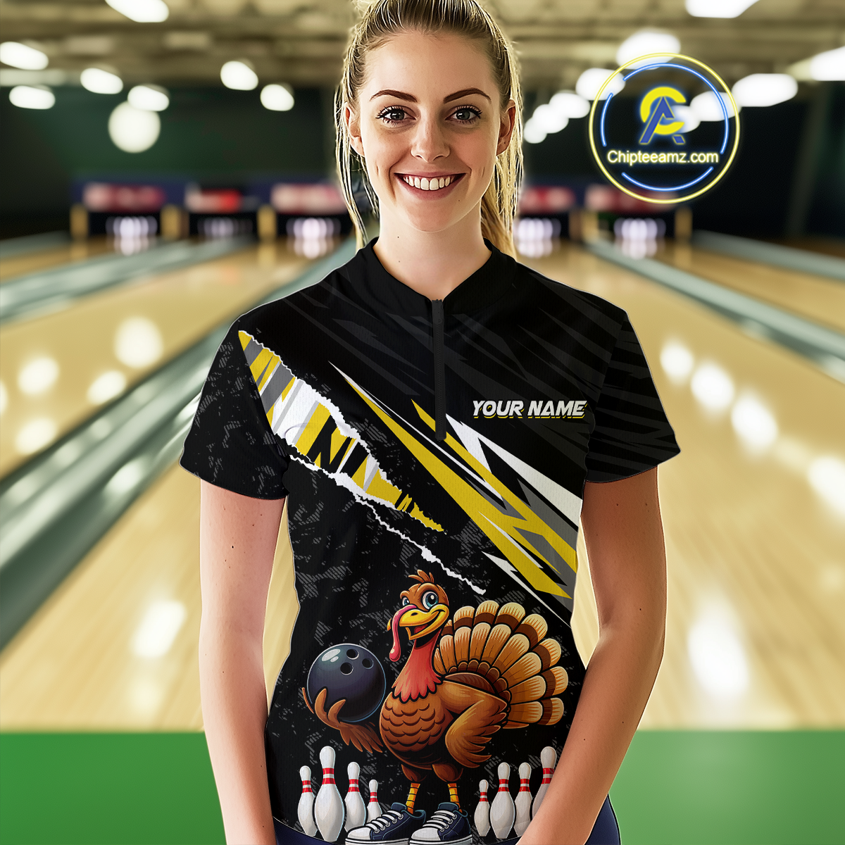Custom Yellow Funny Turkey Bowling Jersey for Women Thanksgiving Bowling Shirts Polo & 1/4 Zip HNT117