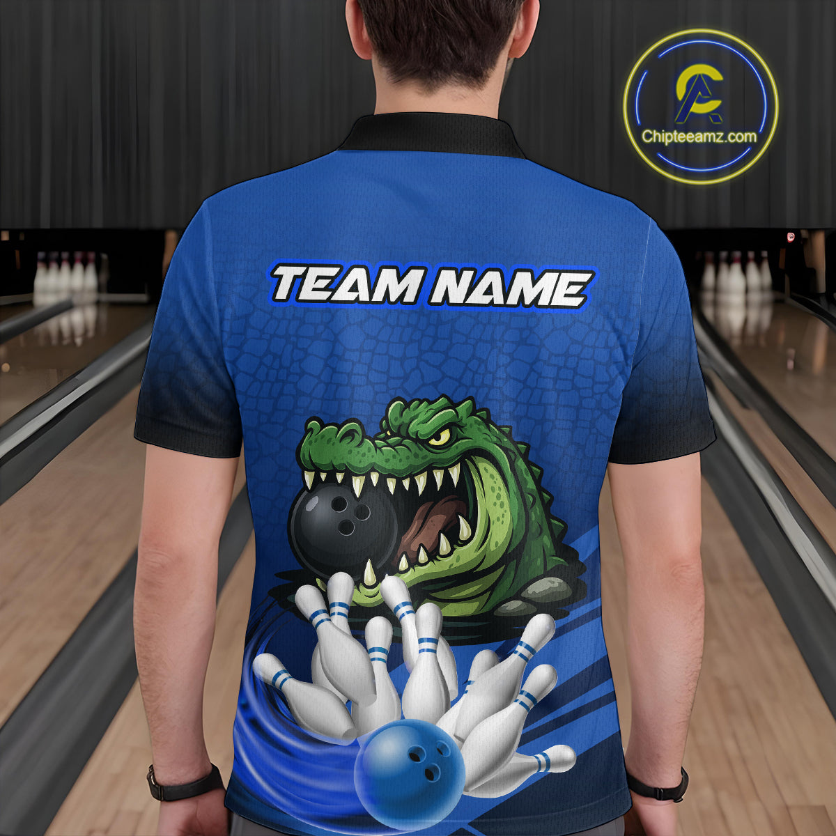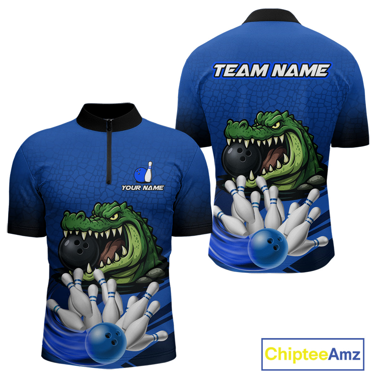 Funny Blue Alligator Bowling Polo, Quarter Zip shirts for Men Custom Team bowling league jersey NQS10630