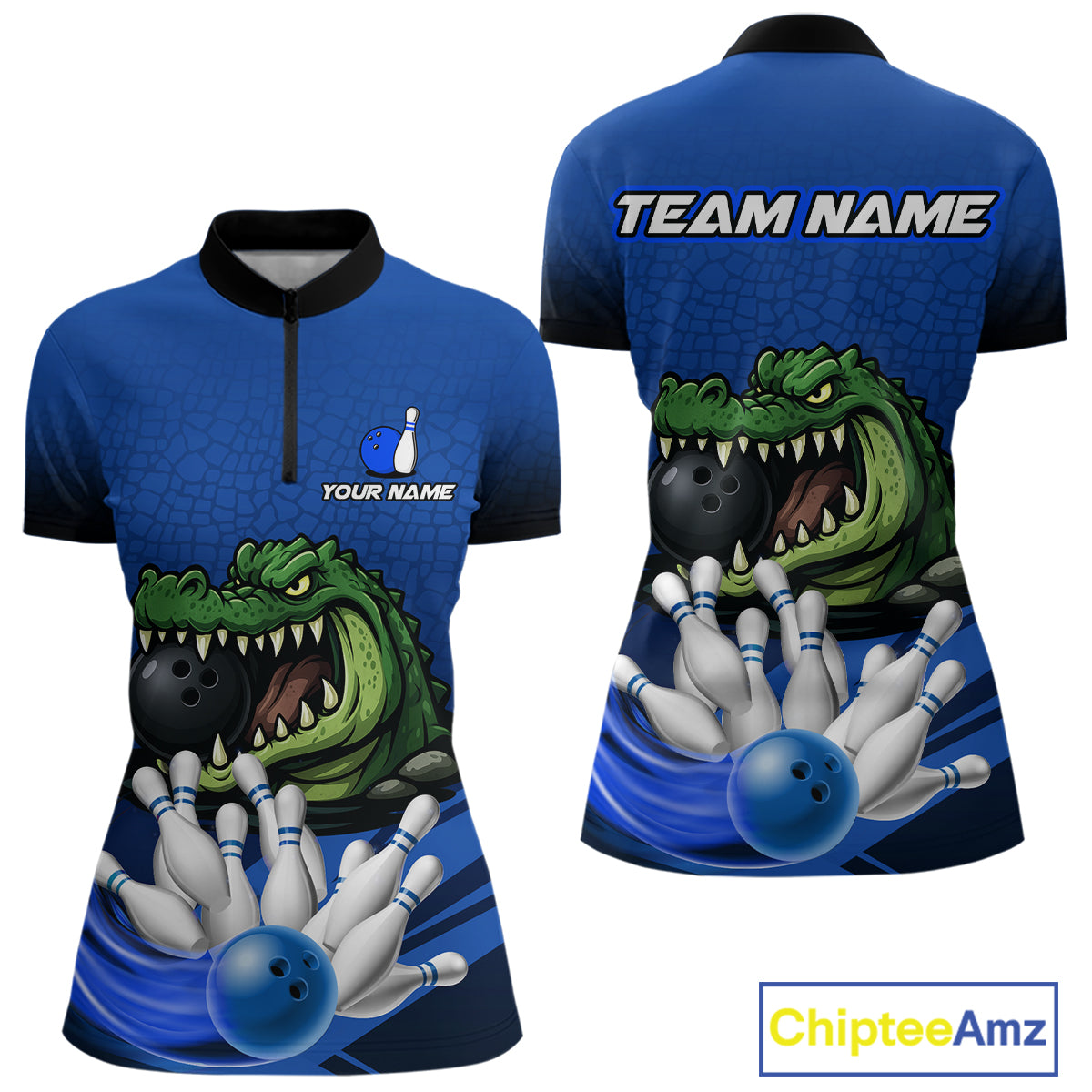 Funny Blue Alligator Bowling Polo, Quarter Zip shirts for Women Custom Team bowling league jersey NQS10630