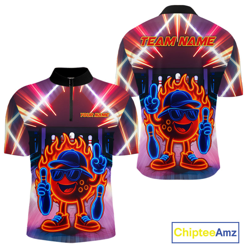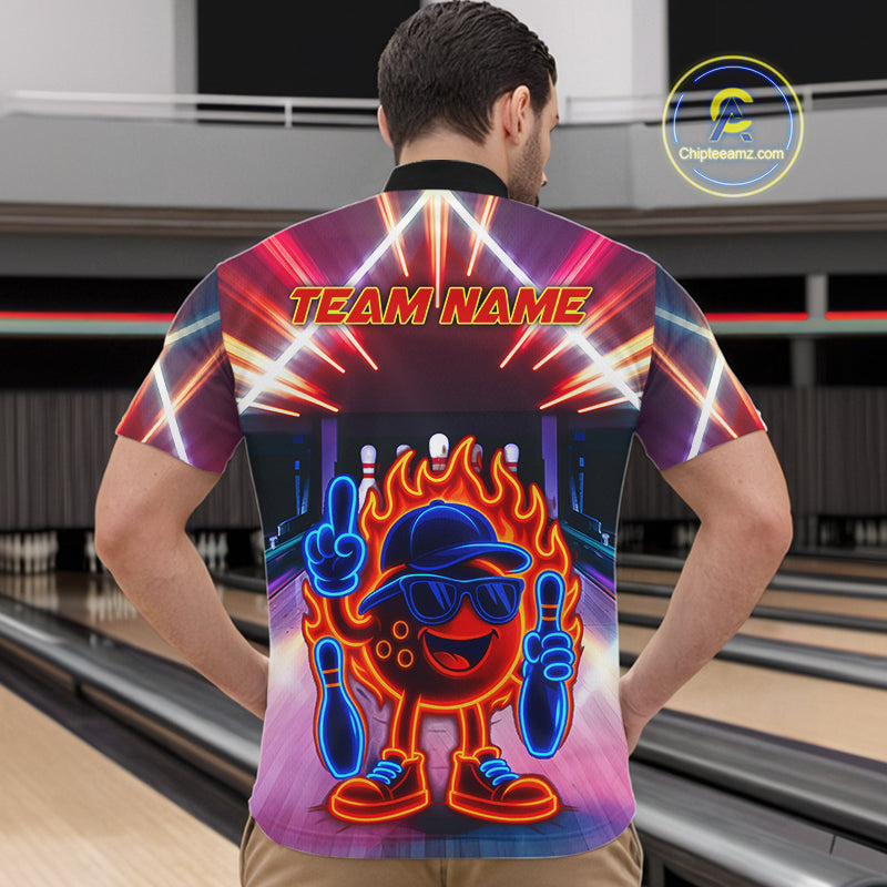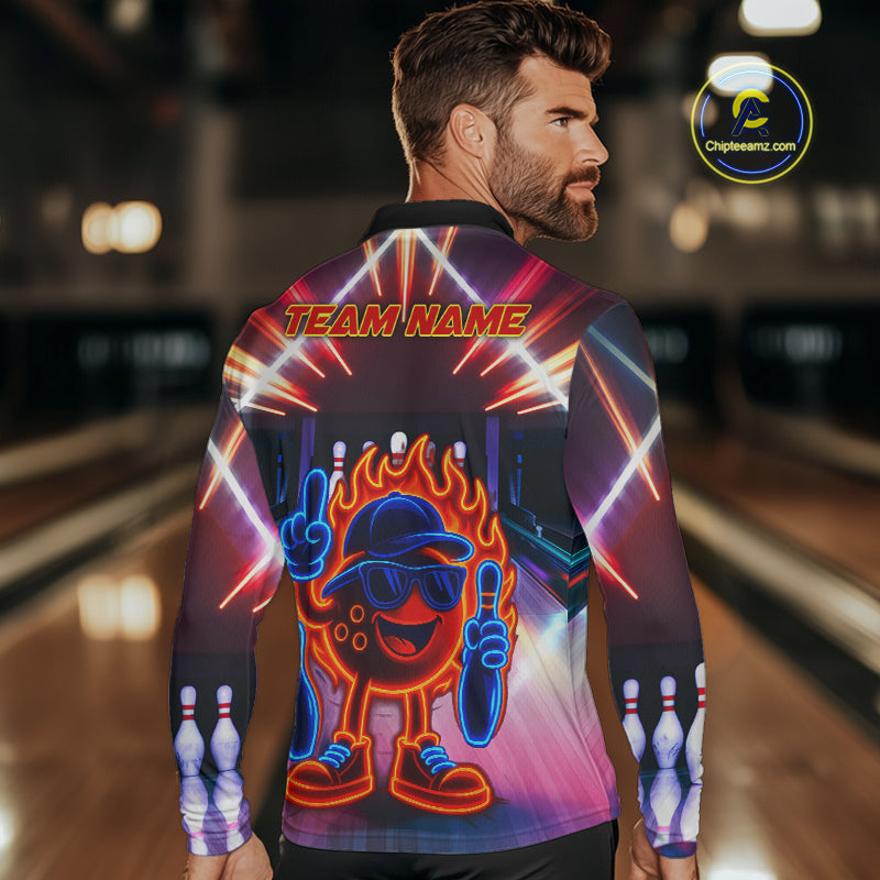 Funny Flame Neon Bowling Ball Mens Bowling Polo, Quarter Zip Shirts Custom Bowling Team jersey NQS10306