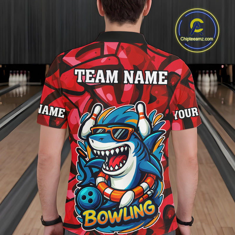 Funny Red Camo Shark Men Bowling Polo, Quarter Zip Shirts Custom Team Shark Bowling Outfit Jersey NQS10076