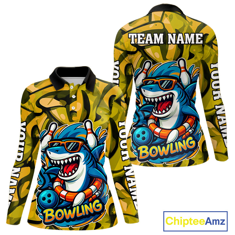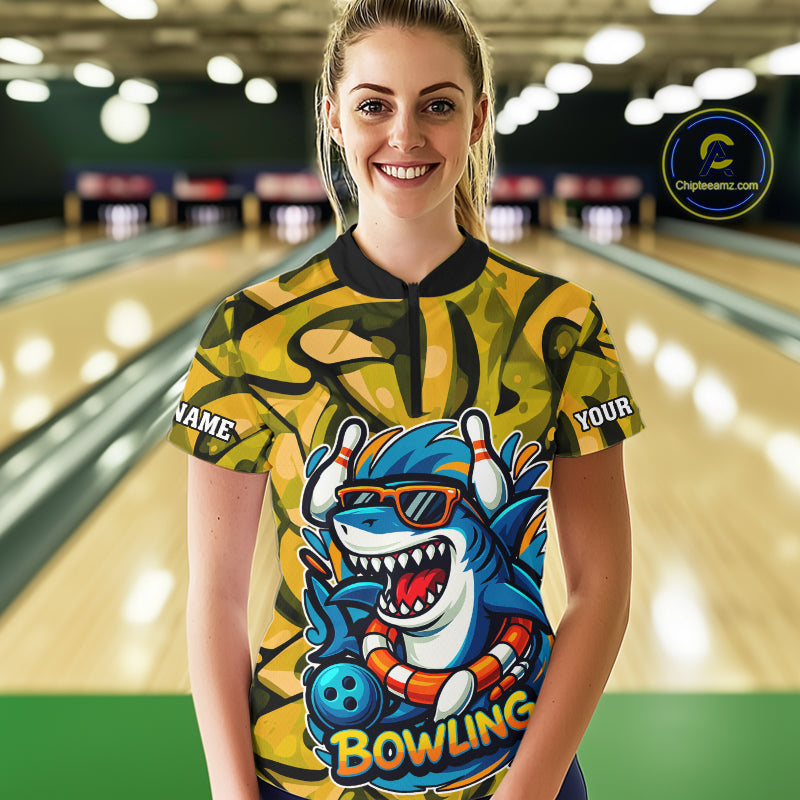 Funny Yellow Camo Shark Women Bowling Polo, Quarter Zip Shirt Custom Team Shark Bowling Outfit Jersey NQS10077