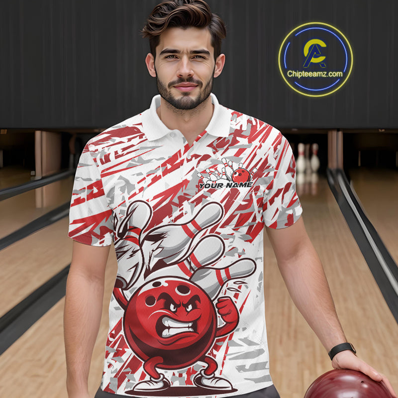 Red Camo Custom Funny Bowling Polo Shirts For Men, Bowling Team Tournament Shirt IPHW9397