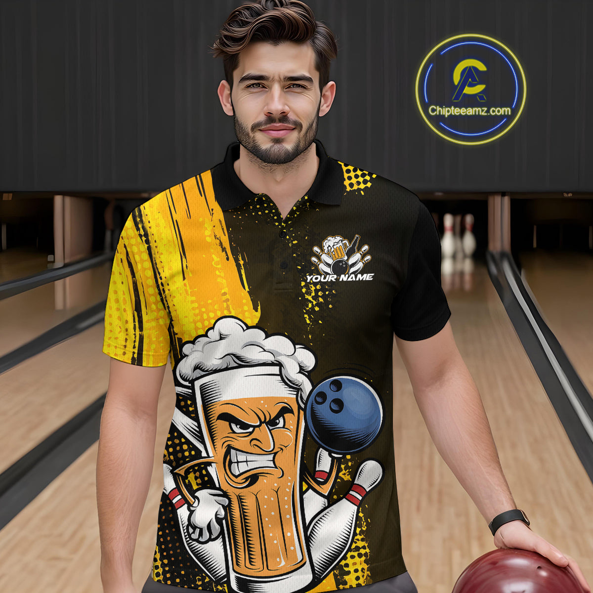 Custom Black And Yellow Funny Bowling And Beer Jerseys, Bowling Team Men Polo Shirts IPHW9606