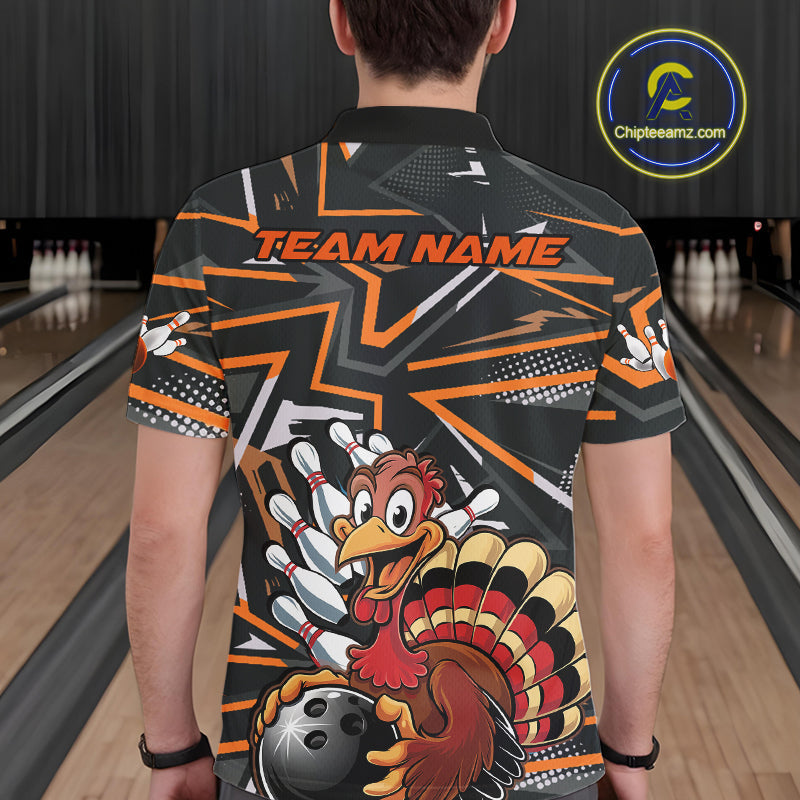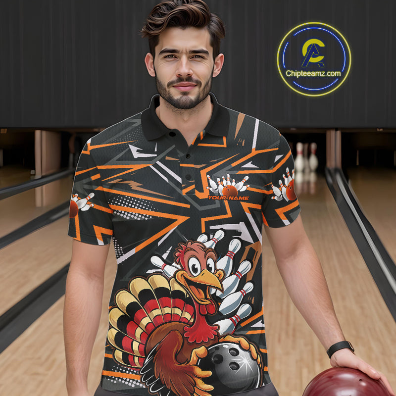 Custom Funny Turkey Bowling Jerseys, Orange Thanksgiving Bowling Team Men Polo Shirt IPHW9723