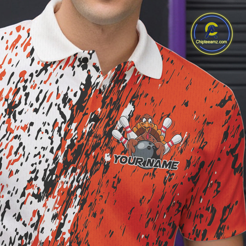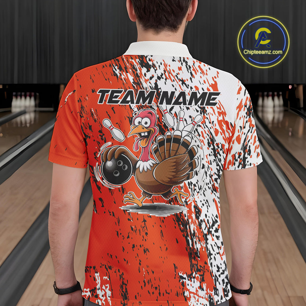 Custom Funny Orange Thanksgiving Turkey Bowling Men Polo Shirts, Turkey Bowling Jerseys IPHW9765