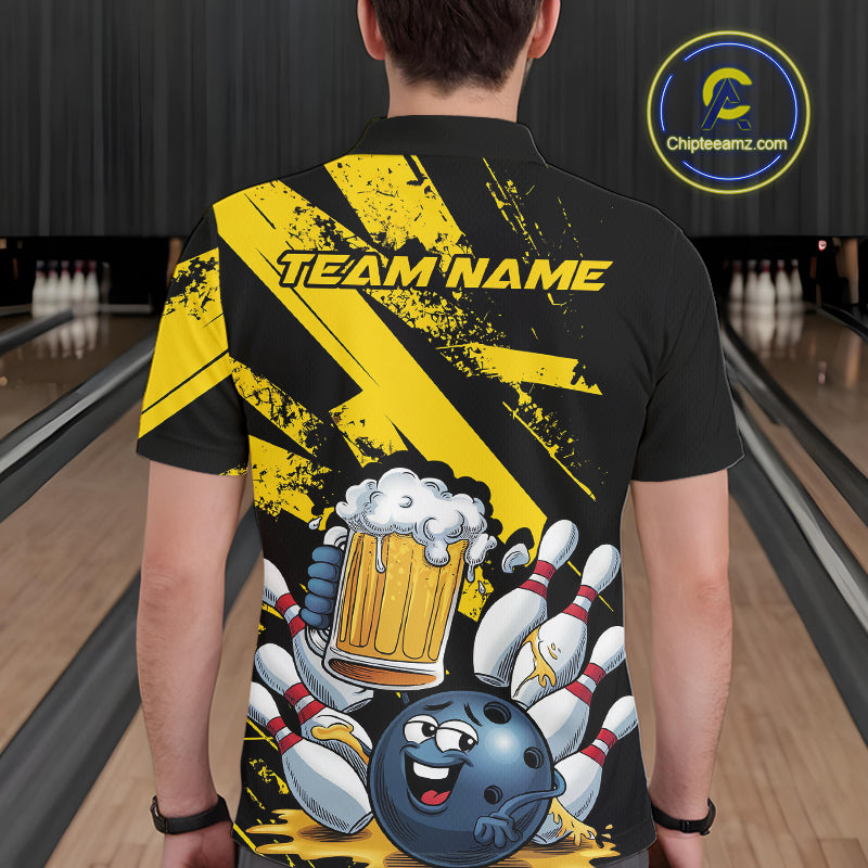 Custom Grunge Yellow Funny Bowling And Beer Polo Shirts For Men, Bowling Team Outfit IPHW9831