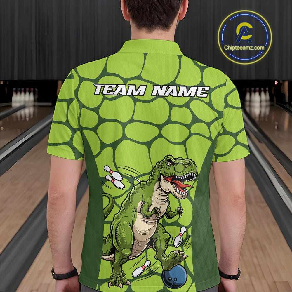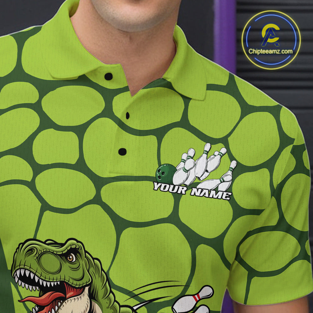 Custom Funny Green Dinosaur Bowling Team Men Polo Shirt, Bowling Tournament Team Shirt IPHW9931