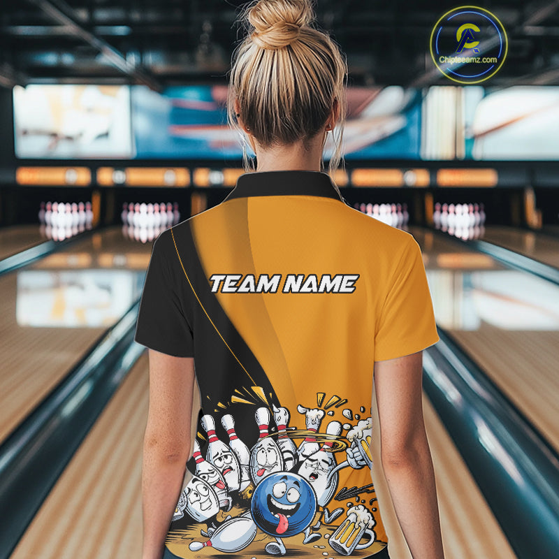 Custom Yellow Funny Bowling Women Polo Shirts, Bowling And Beer Party Bowlers Outfit IPHW9610
