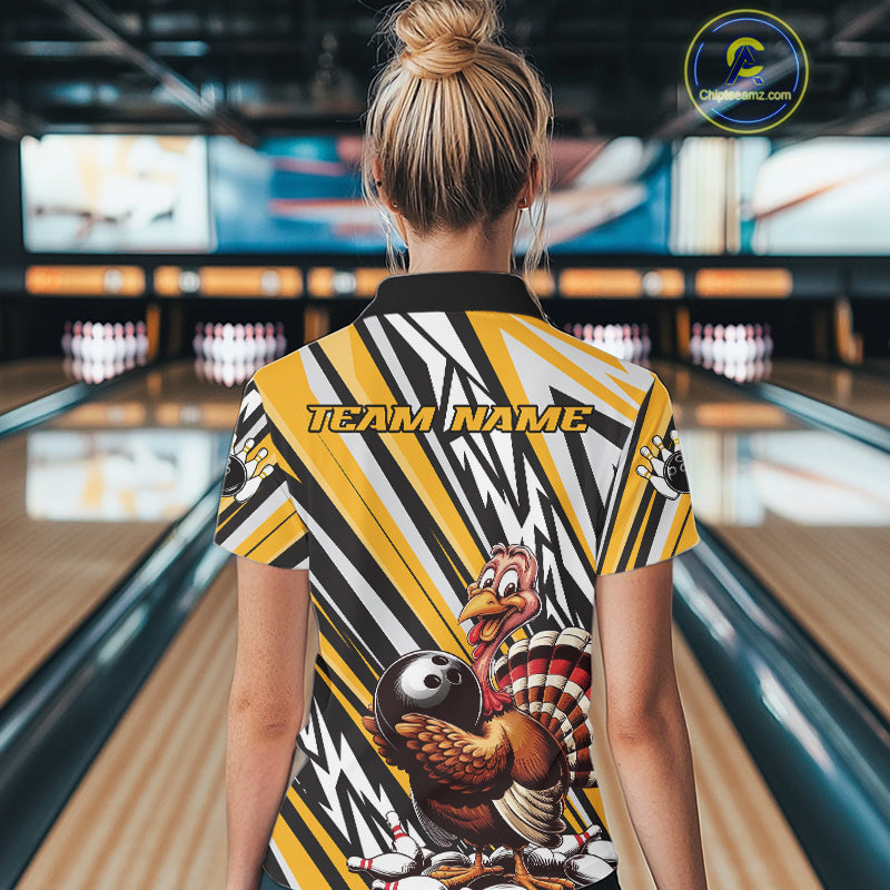 Custom Yellow Funny Thanksgiving Turkey Bowling Team Women Polo Shirts, Bowling Jerseys IPHW9720
