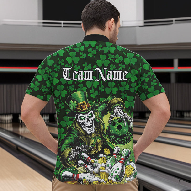Custom Funny Saint Patricks Day Skull And Beer Bowling Quarter-Zip Shirt For Men, Lucky Team Shirt IPHW8607