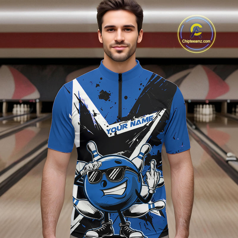 Custom Black And Blue Star Funny Bowling Quarter-Zip Shirts For Men, Bowling Tournament Shirt IPHW9359