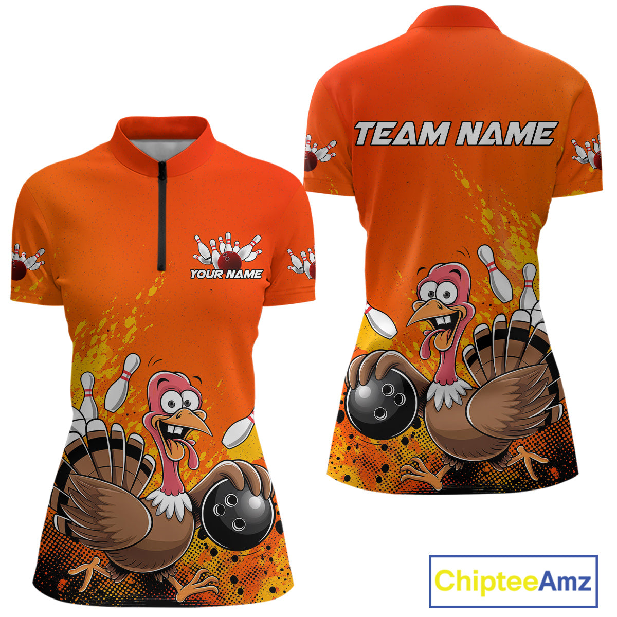 Custom Funny Turkey Bowling Thanksgiving Bowing Outfit Team Quarter-Zip Shirts For Women IPHW9786