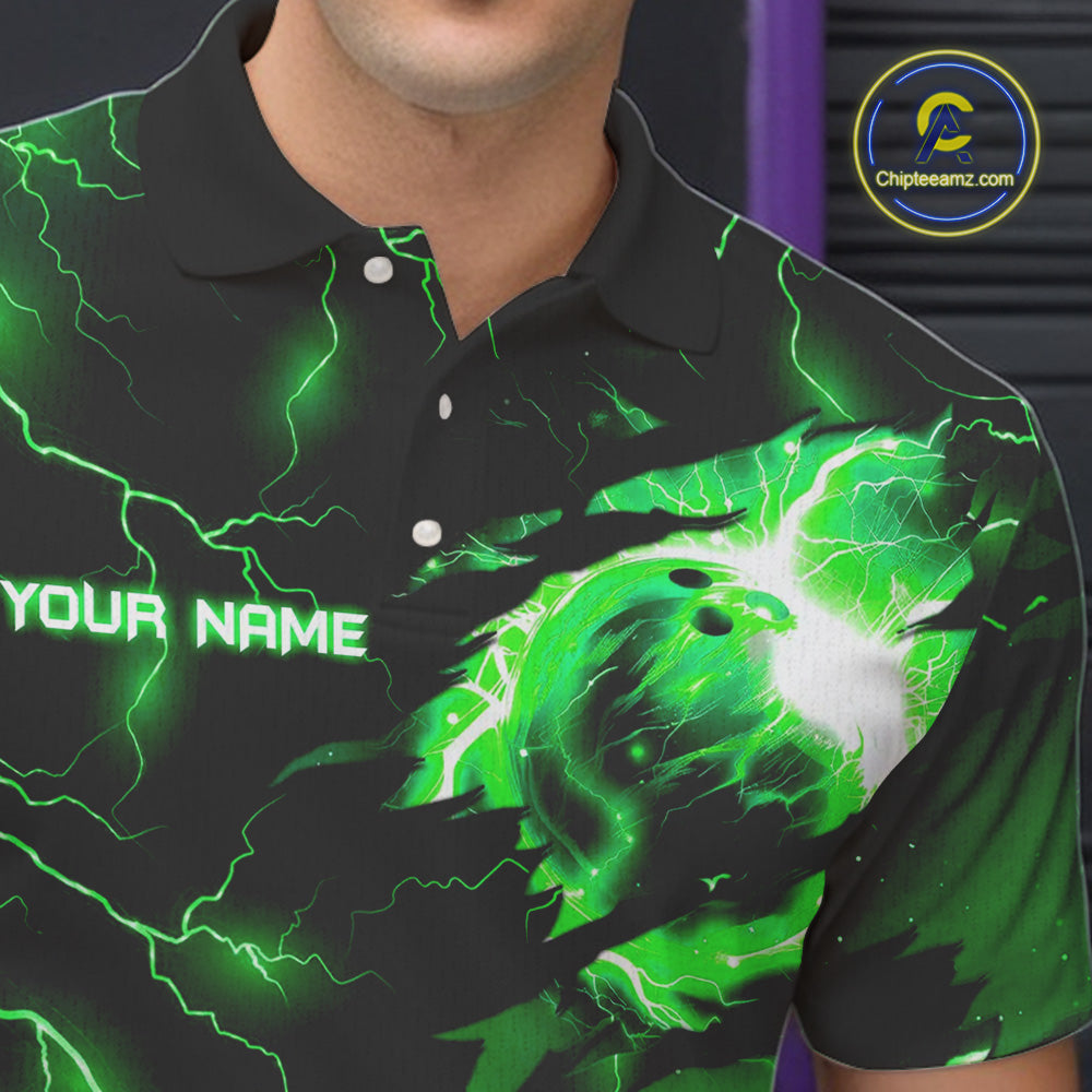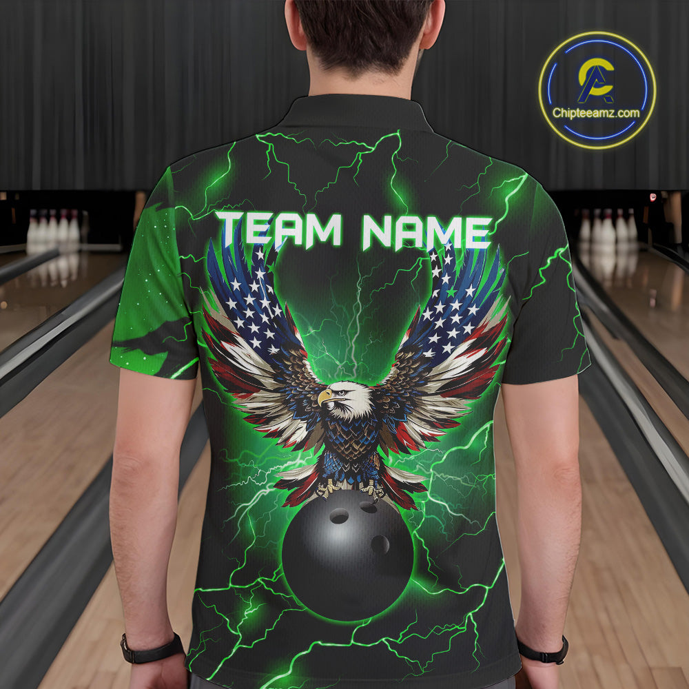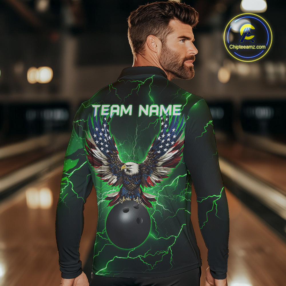 Green lightning thunder bowling American flag Eagle custom Mens Bowling Polo, Quarter Zip Shirts NQS10111