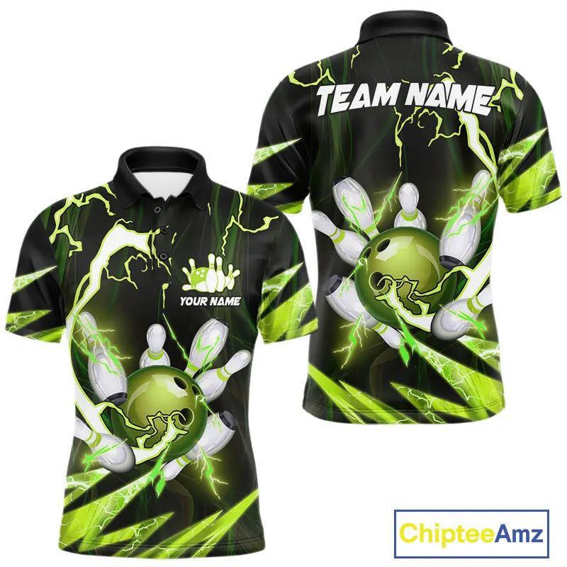 Green Thunder Lightning bowling ball and pins jerseys Custom Team Bowling Polo, 1/4 Zip Shirts For Men NQS9832