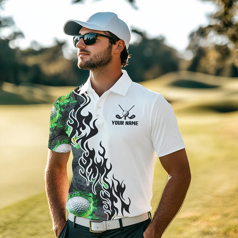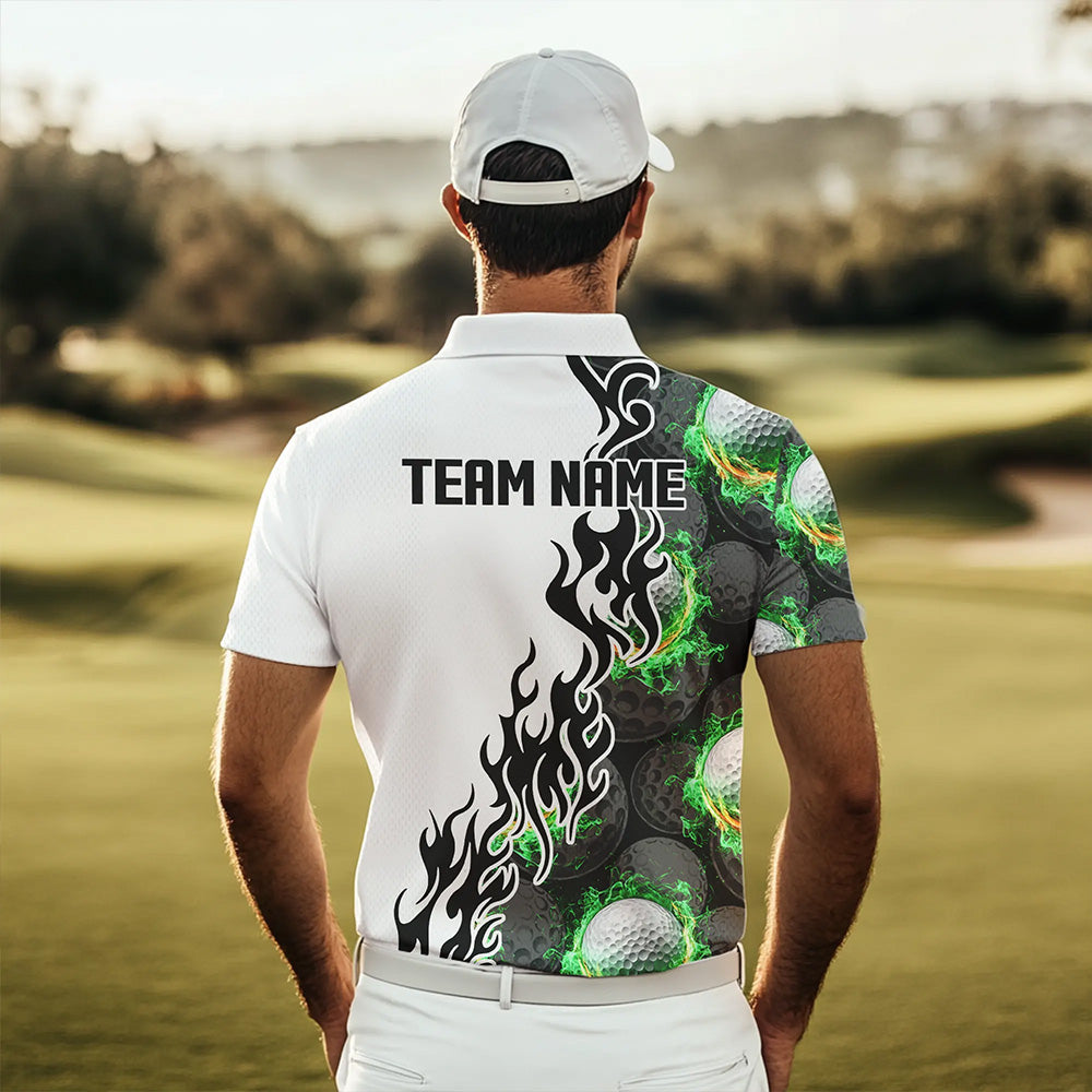 Green Flame Golf Ball pattern fire Black and White Mens golf polos shirts custom golf attire for men NQS9435