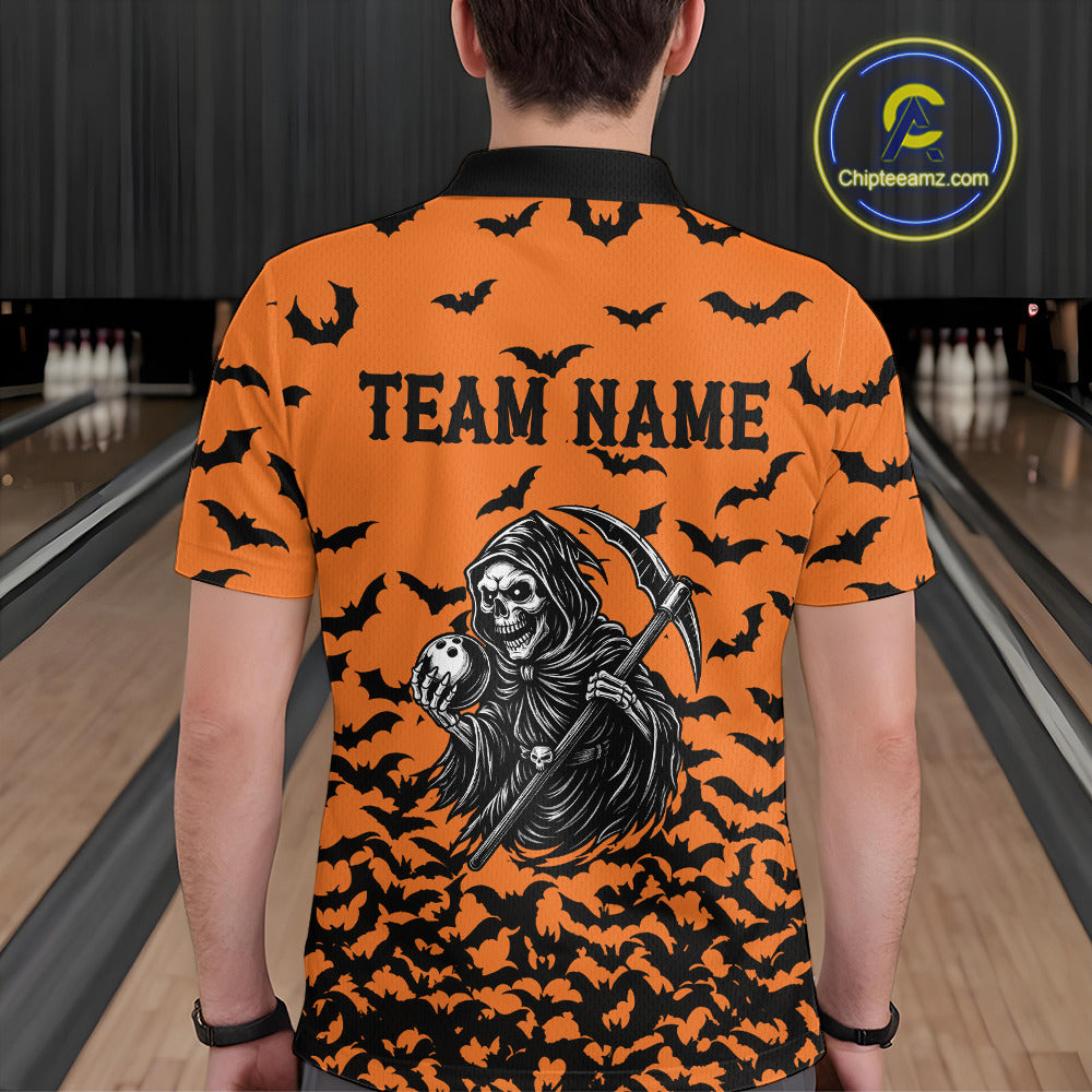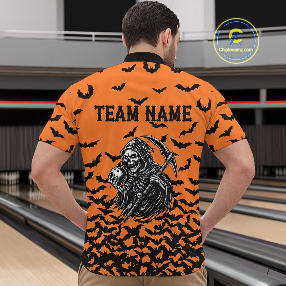 Black and Orange Bats Halloween Skull Reaper Bowling Shirts For Men Custom Bowling Team Jerseys NQS10755