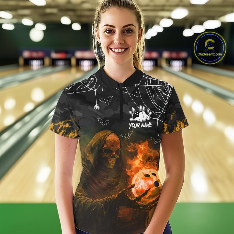 Black Bowling Camo Orange flame Skull Custom Halloween Bowling Shirts For Women, Bowling Team Jerseys NQS10705