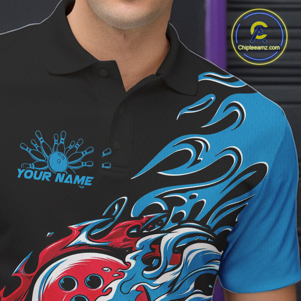 Custom Blue And Red Flame Skull Bowling Polo Shirt For Men, Halloween Bowling Jersey IPHW9888