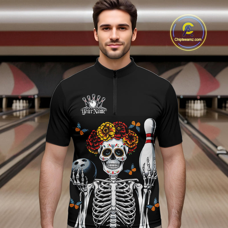 Custom Sugar Skull Bowling Team Men Quarter-Zip Shirts, Funny Halloween Bowling Outfit IPHW9752