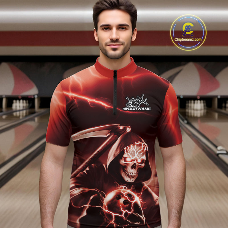 Custom Red Lightning Grim Reaper Bowling Quarter-Zip Shirts For Men, Halloween Bowling Jerseys IPHW9845
