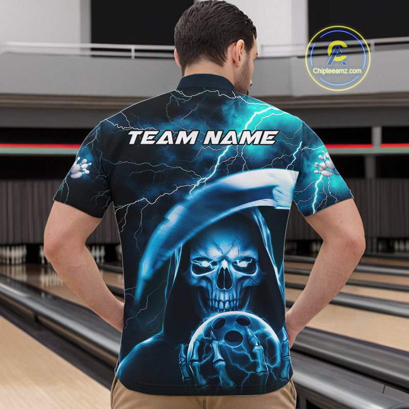 Custom Blue Thunder Lightning Grim Reaper Skull Halloween Bowling Quarter-Zip Shirts For Men IPHW9851