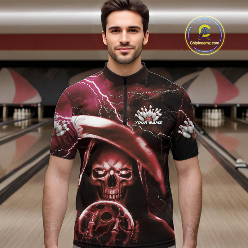 Custom Red Thunder Lightning Grim Reaper Skull Halloween Bowling Quarter-Zip Shirts For Men IPHW9854