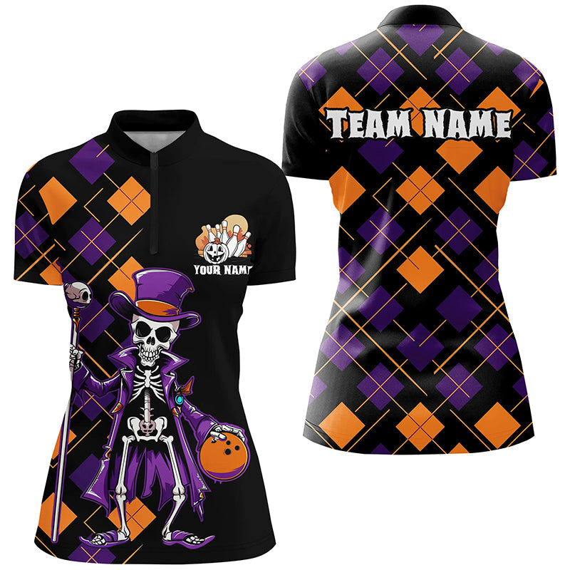 Custom Funny Halloween Skull Ladies Bowling Shirts, Halloween Argyle Pattern Bowling Outfit IPHW7123
