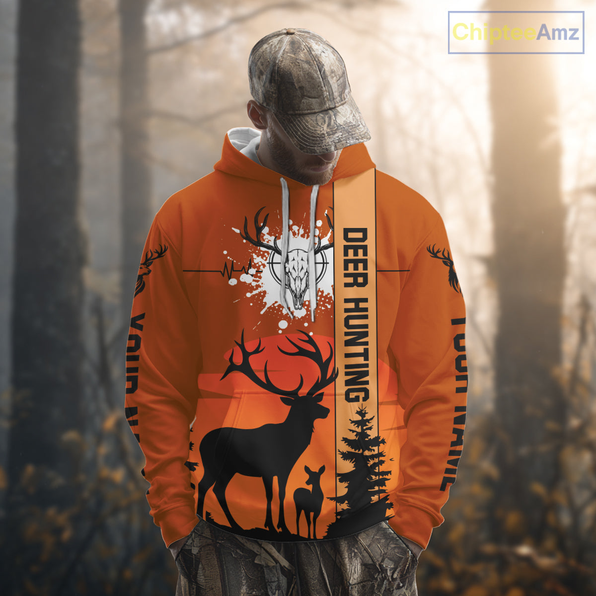Custom Deer Hunting Shirt Orange 3D All Over Print with Deer Skull & Forest Silhouette NHT33