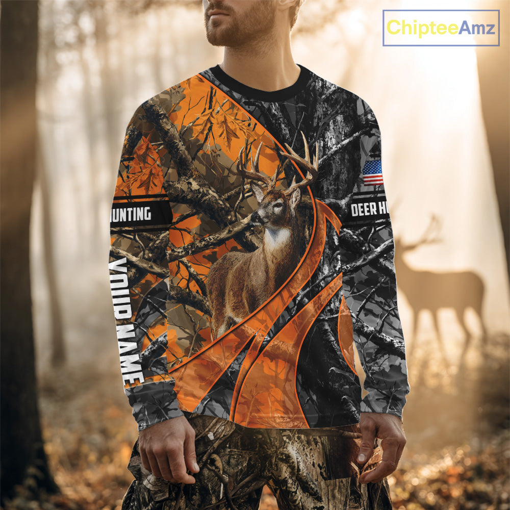 Whitetail Deer Hunting Orange and Black Camo Shirts with US Flag, Personalized Hunting Shirt NBT68