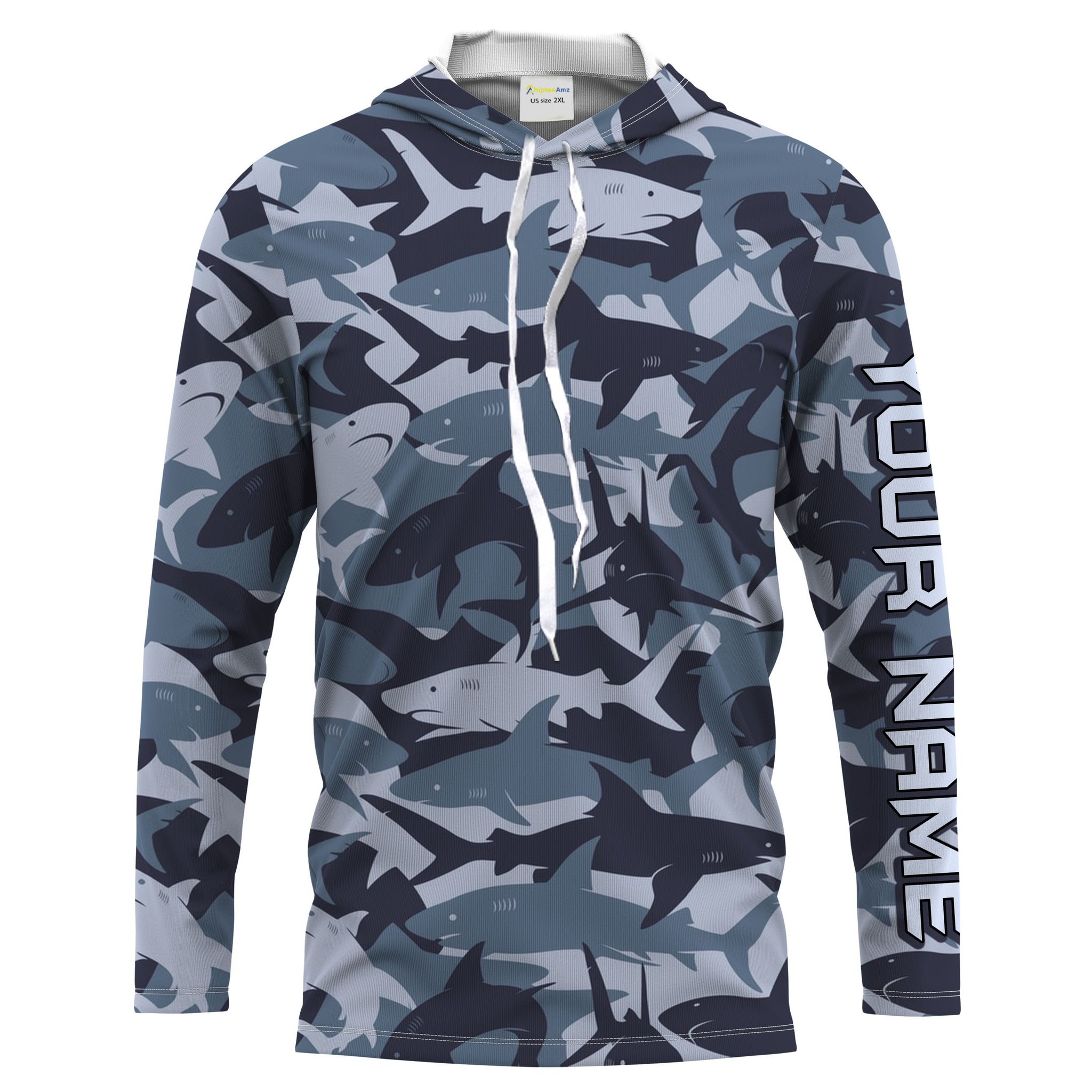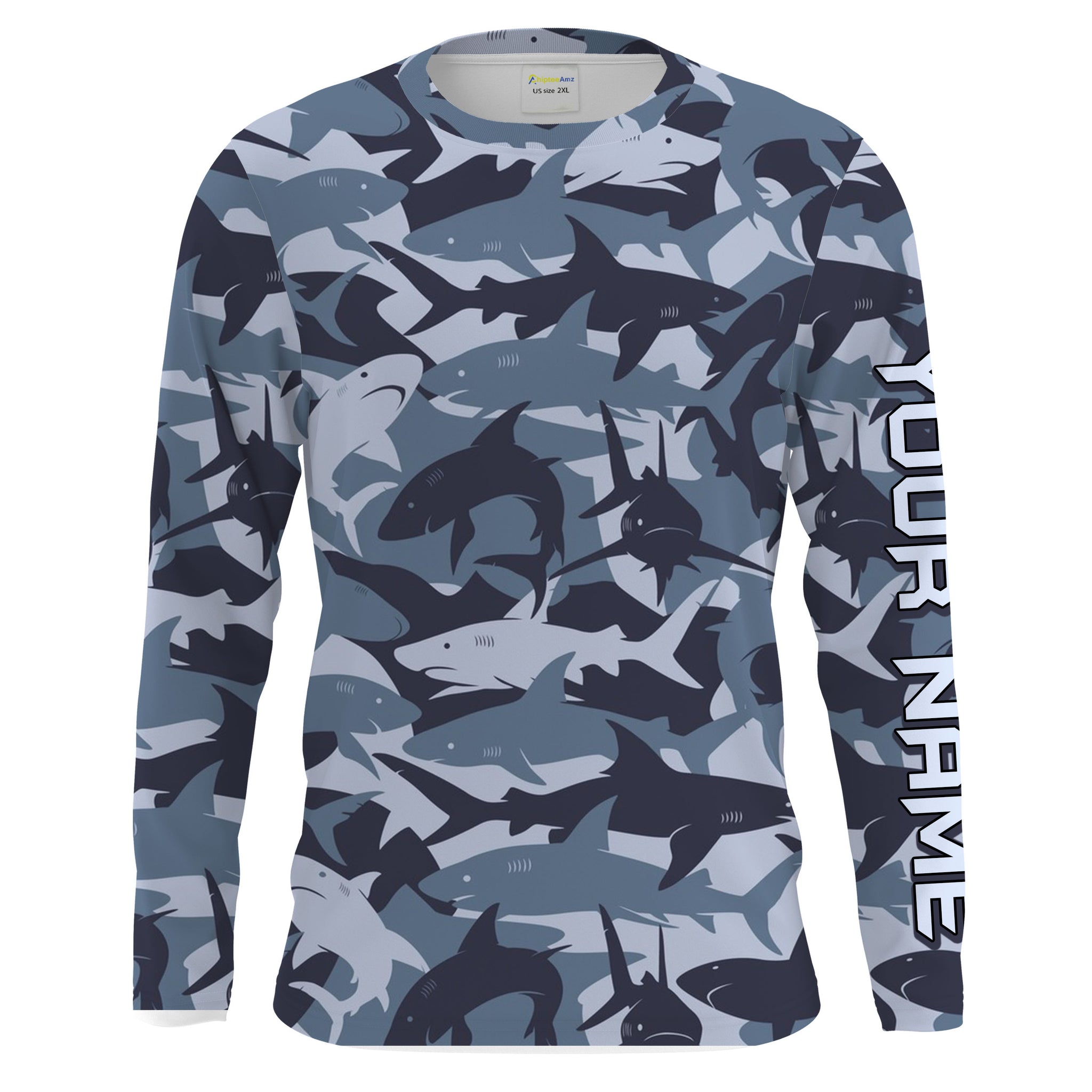 Shark fishing camo UV protection customize name long sleeves fishing shirts UPF 30+, fishing shirt for men, women, kid NQS2190