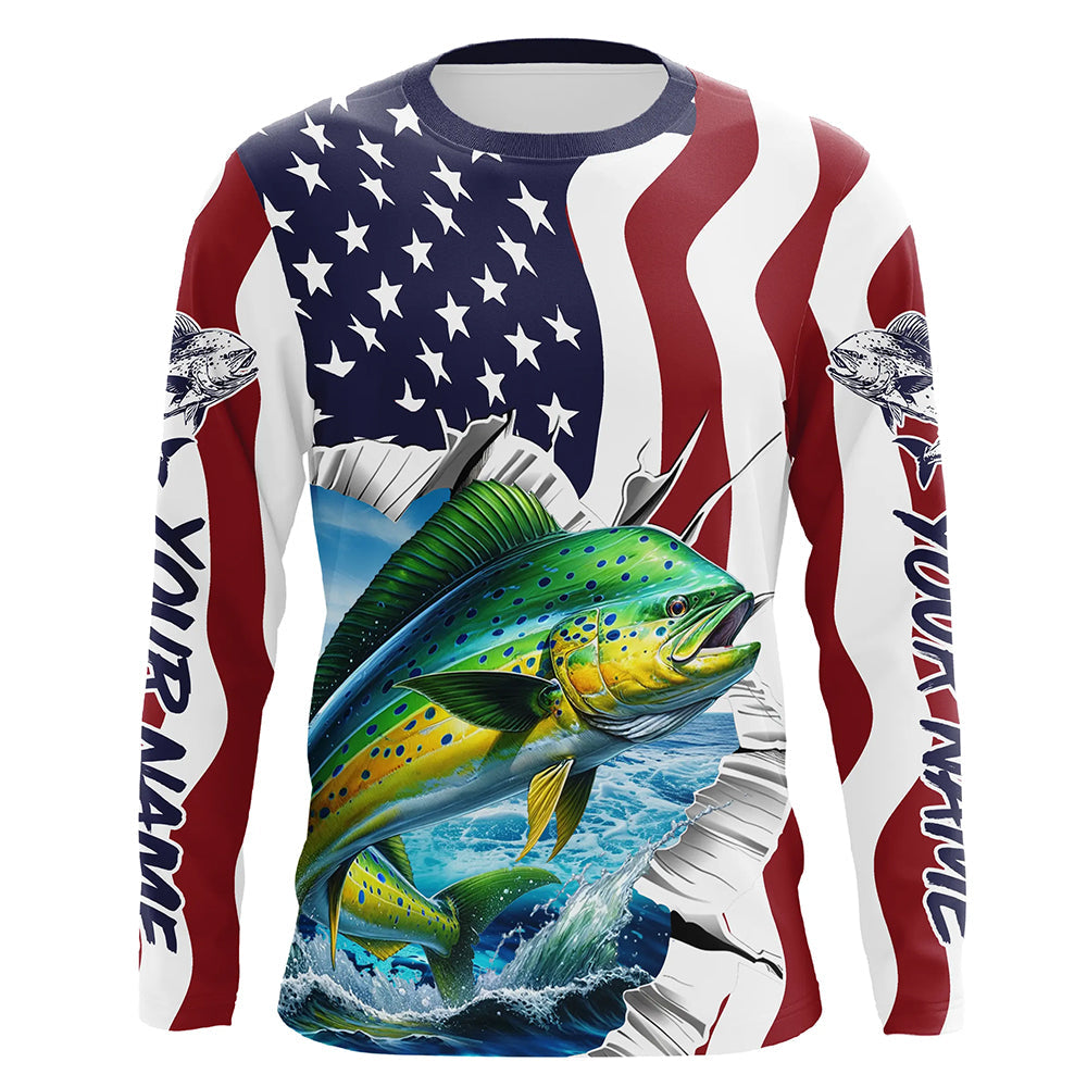 Custom American Flag Mahi Mahi Long Sleeve Fishing Shirts, Patriotic Mahimahi Fishing Jerseys IPHW6118