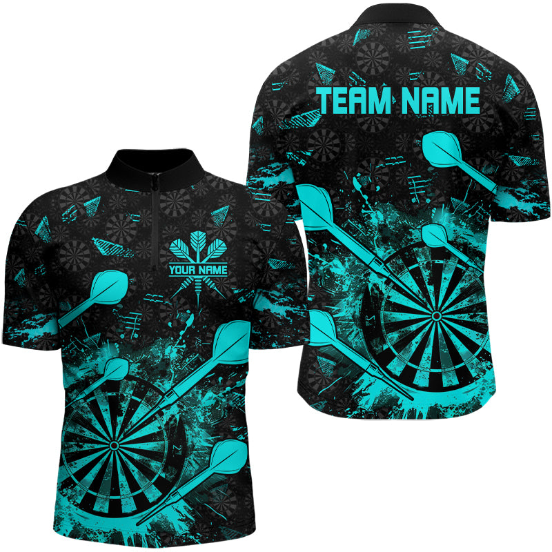 Black And Turquoise Grunge Darts Polo, Quarter Zip For Men Custom Dart Shirts For Team Dart Jerseys TDM3226