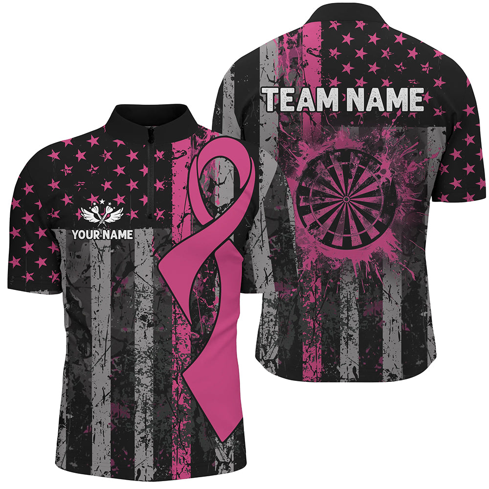 Custom Pink Ribbon Grunge American Flag Patriotic Darts Shirts For Men, Breast Cancer Darts Jerseys TDM2511