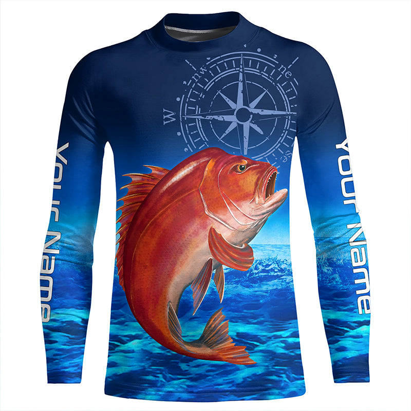 Personalized Red snapper Blue Long Sleeve Performance Fishing Shirts, compass tournament Shirts NQS5903