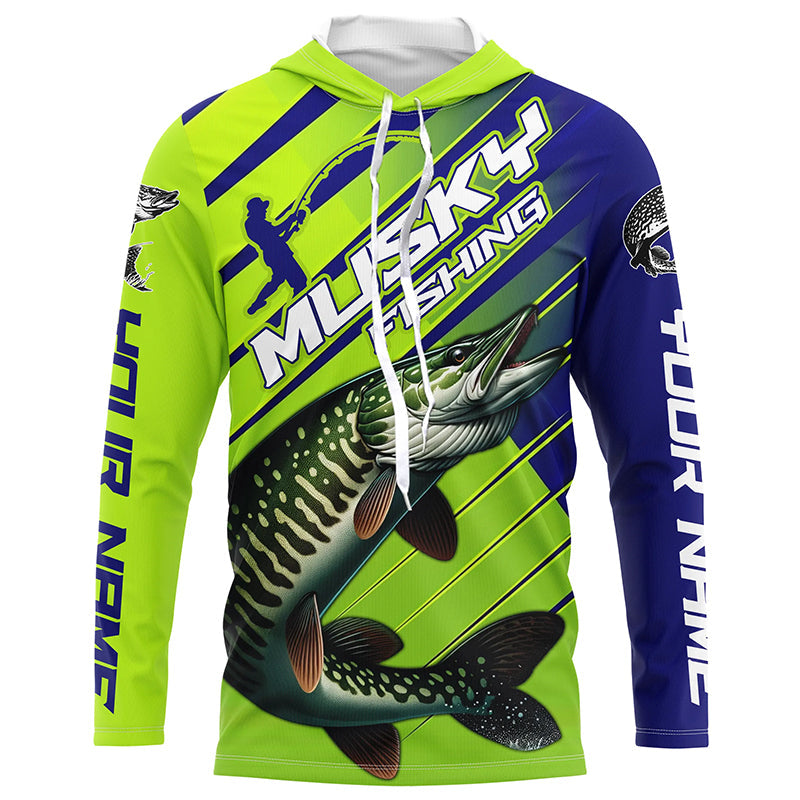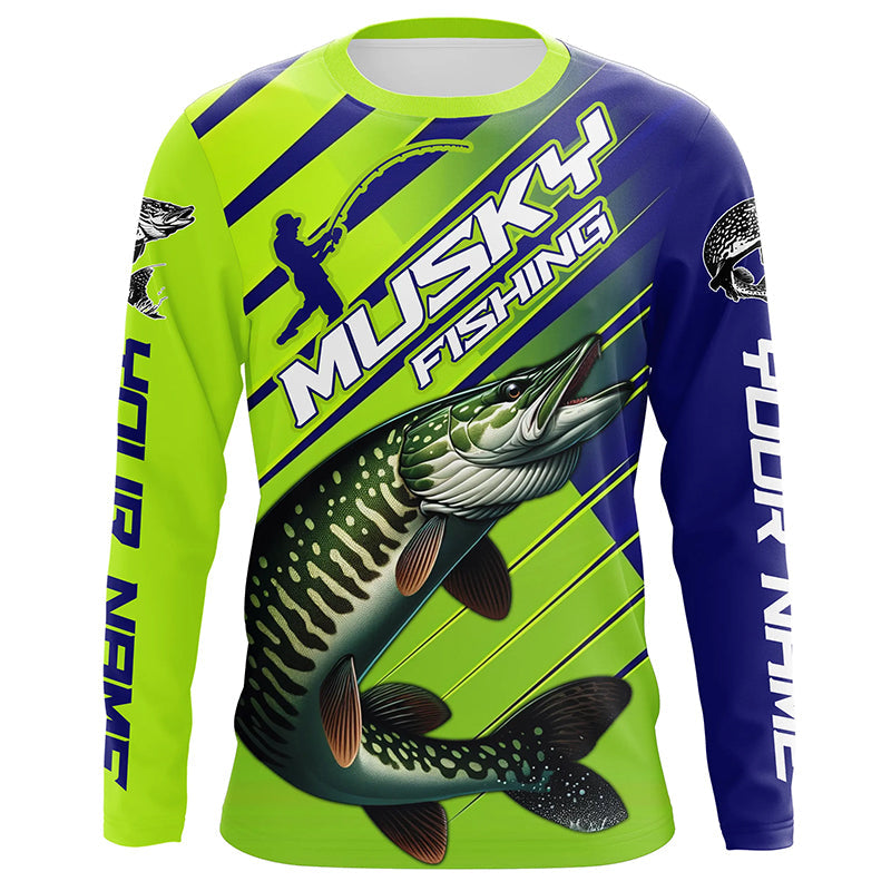 Musky Custom Long Sleeve Tournament Fishing Shirts, Muskie Fishing Jerseys | Green And Blue IPHW6211