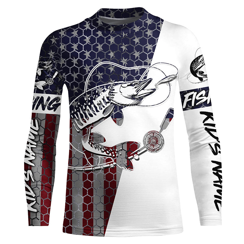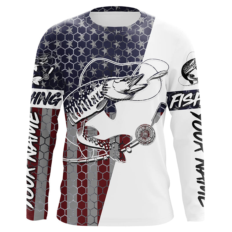 Custom Musky Fishing American Flag Shirts, Patriotic Musky Long Sleeve Fishing Jerseys IPHW6292